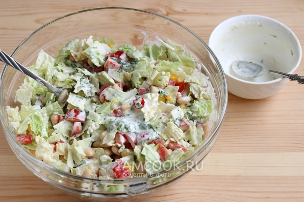 Заправляем салат йогуртовой заправкой.