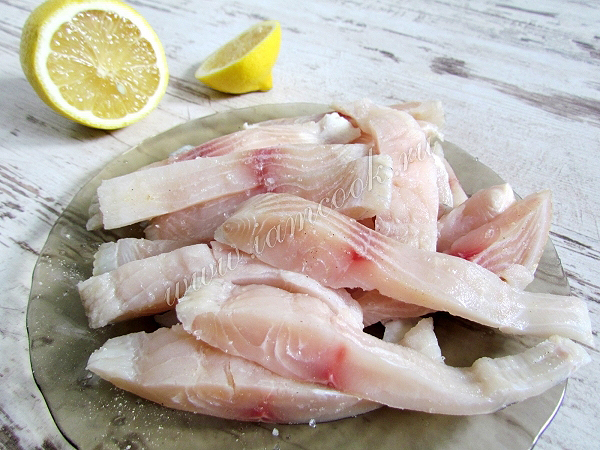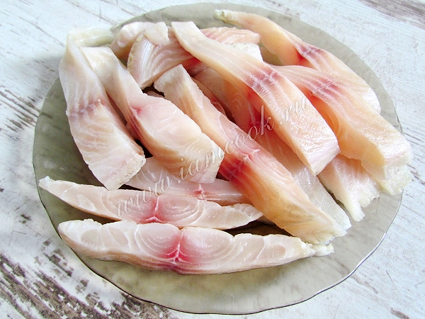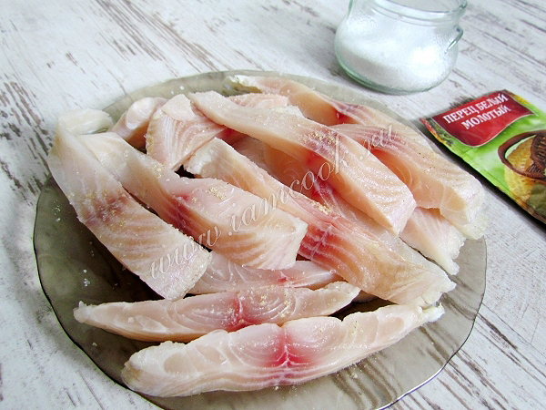 Рыбное филе промойте, просушите бумажным полотенцем и нарежьте длинными полосками.