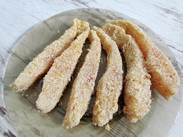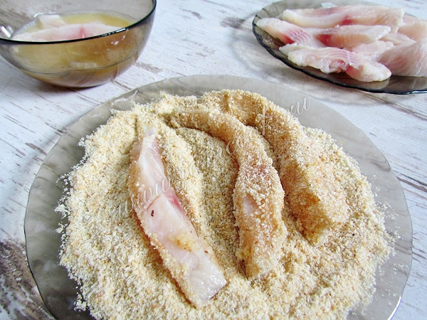 Снова опустите рыбные полоски в яйцо и в сухари.
