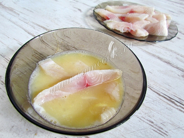 Опустите во взбитые яйца каждый кусочек рыбного филе.
