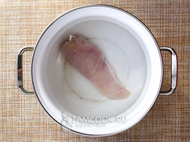 Для начала сварим куриный бульон. Налейте в кастрюлю 1 литр воды, положите курицу и варите 40 минут.