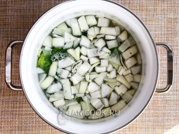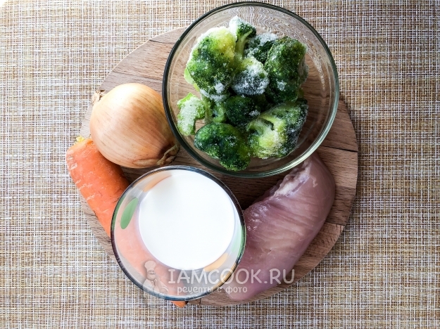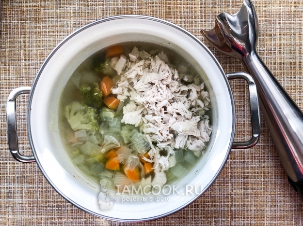 Курицу выньте из кастрюли. Положите в бульон морковь, лук, брокколи и варите 20 минут.
