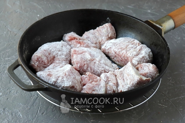 В сковороде разогреть растительное масло. Мясо посолить и поперчить по вкусу, затем обвалять в муке и выложить на сковороду.