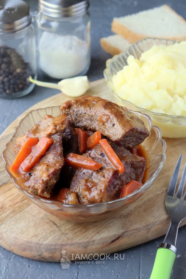 Вот и всё, вкусная тушеная говядина крупными кусками с подливкой готова. Подавать блюдо в горячем виде с любым гарниром, замечательно подходят отварной рис и картофельное пюре.