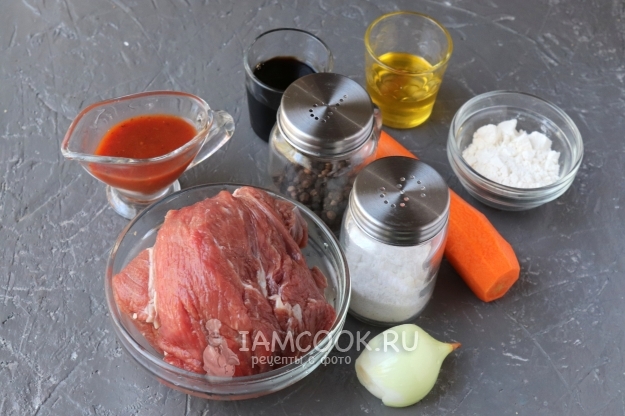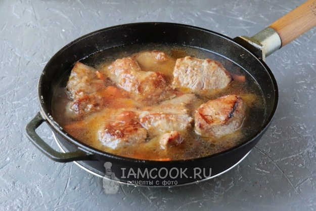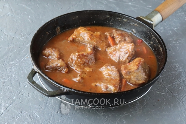 Накрыть сковороду крышкой и тушить говядину на медленном огне около 45-60 минут, в зависимости от жёсткости мяса, не забывая периодически помешивать, чтобы подлива не подгорела.