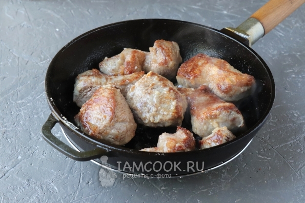 На сильном огне обжарить мясо в течение 5 минут, периодически помешивая, до образования румяной корочки.