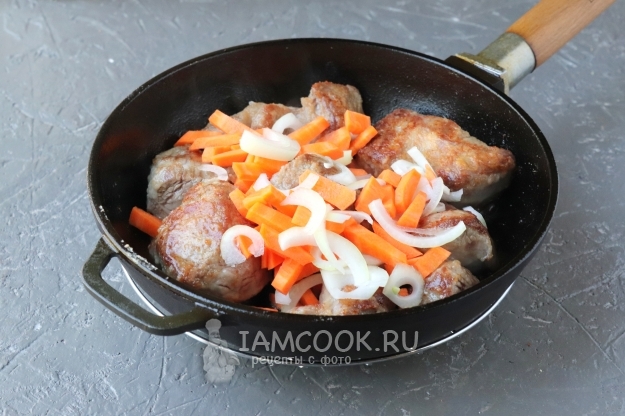 Тем временем очистить овощи. Лук нарезать полукольцами, морковь - брусочками. Отправить овощную нарезку к мясу, перемешать и жарить 2-3 минуты.