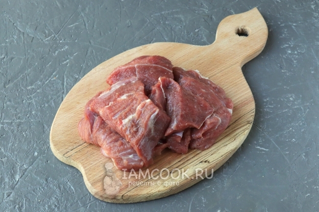 Мясо помыть под проточной водой, обсушить и нарезать крупными кусками. Если есть на мясе прожилки, плёнка или излишки жира, их нужно обязательно обрезать.