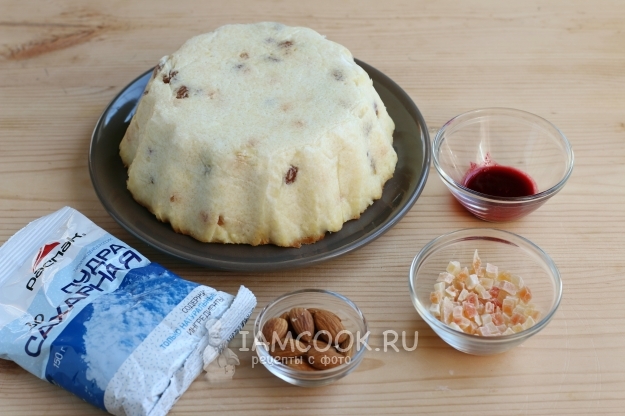 Польем запеканку помадкой и украсим цукатами и измельченными орешками миндаля.