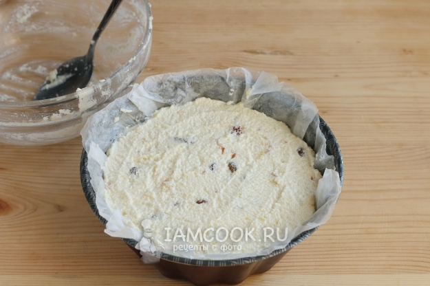 Для выпечки королевской запеканки я использовала достаточно высокую форму для кекса, и хотя у нее антипригарное покрытие, застелила ее пергаментом, немного смоченным водой. Это делается для того, чтобы пергаменту легче было принять необходимую форму. Пергамент совсем чуть-чуть смачивается водой и отжимается, потом укладывается в форму, после его можно смазать сливочным маслом. После таких манипуляций выкладываем творожную массу в форму, отправляем в разогретую до 160 градусов духовку и выпекаем примерно 80-90 минут.