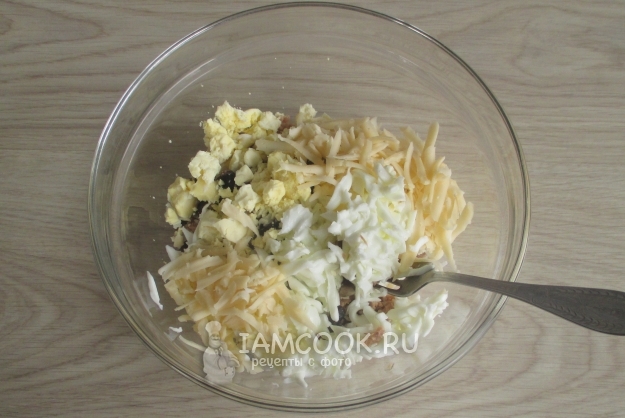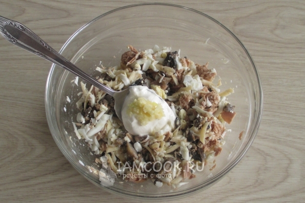 Соедините ингредиенты и заправьте сметаной с добавлением в неё измельченного чеснока.