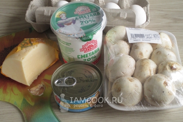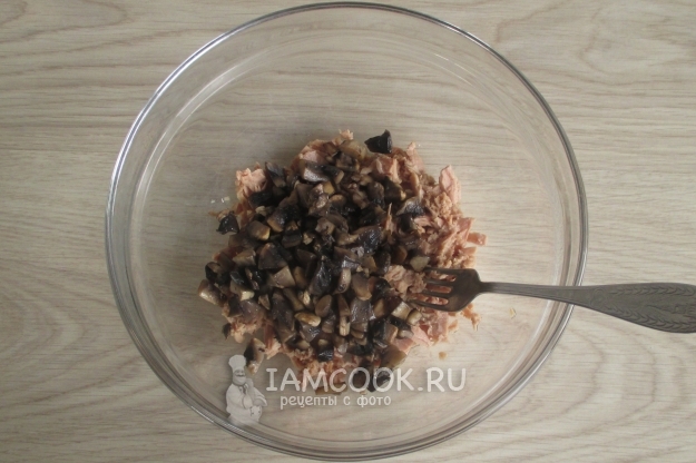 Салат с консервированным тунцом и шампиньонами выглядит невзрачно, но имеет одновременно яркий и гармоничный вкус.