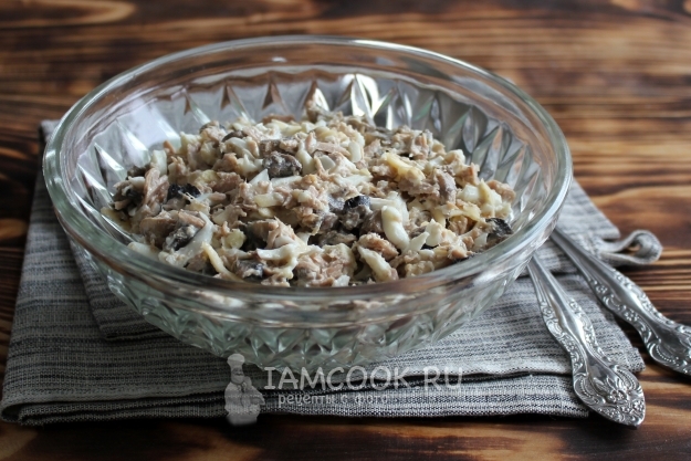 Такой сытный салат из консервированного тунца с шампиньонами практически универсален. Он подходит и в повседневное меню, и на праздничный стол, и также годится для белковой диеты.