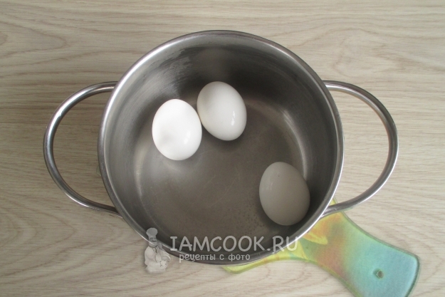 Яйца для салата нужно сварить вкрутую (около 10 минут), затем охладить и очистить.