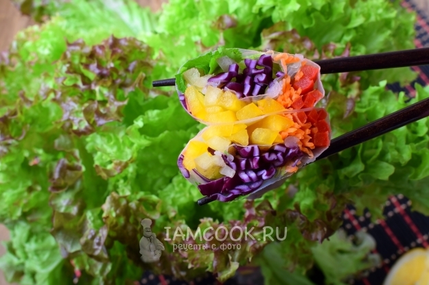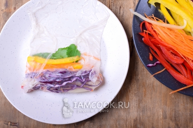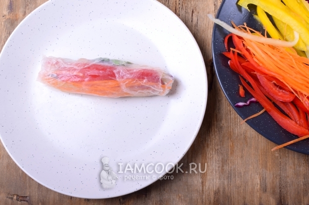 И наконец, свернем спринг-ролл. Так как бумага в размоченном состоянии липкая, проблем с фиксацией не будет.