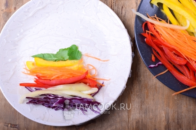 Погрузим один лист рисовой бумаги в воду на несколько секунд, этого времени будет достаточно, чтобы бумага стала пластичной. Дадим стечь лишней воде, выложим подготовленную бумагу на удобную поверхность и сразу же заполним овощами, взяв каждого овоща понемногу. Располагаем овощи в ряд, начиная от нижнего края, двигаясь к центру листа. Добавим листочек мяты и кинзы.