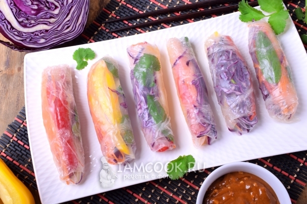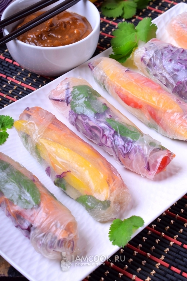 Радужные спринг-роллы с арахисовым соусом - вегетарианские, постные и подходят для здорового питания.