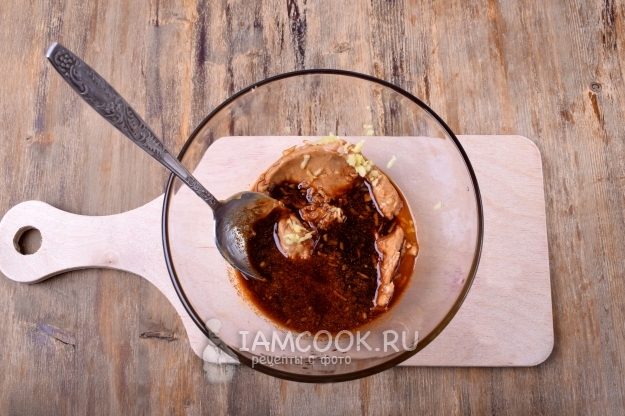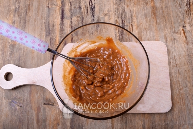 Перемешаем соус венчиком, слегка взбивая его, чтобы получилась однородная густая смесь. Оставим соус при комнатной температуре немного настояться, пока занимаемся начинкой.