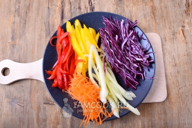 Овощи для начинки нужно нарезать максимально тонко длинными полосками. Морковь можно натереть на корейской терке. От кинзы и мяты понадобятся только листочки, их можно оставить целыми.