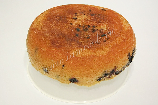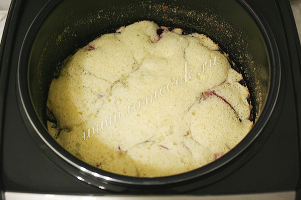 Чашу мультиварке смажьте сливочным маслом и обсыпьте панировочными сухарями. Вылейте в неё тесто. Сверху высыпьте ягоды. Перемешивать их с тестом не надо. В процессе выпечки они сами опустятся ближе ко дну. Закройте мультиварку и выставьте режим Выпечка. В зависимости от модели мультиварки, температуру и время можно или нельзя регулировать. Поскольку моя модель позволяет, то я выпекаю при 150 градусах 65 минут.