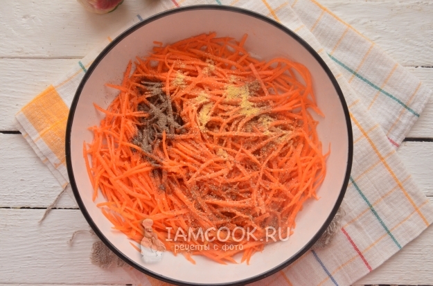 Теперь добавьте специи - как по мне, для овощей по-корейски идеально подходят молотый кориандр, пажитник, черный молотый перец. Другие специи я обычно не использую.