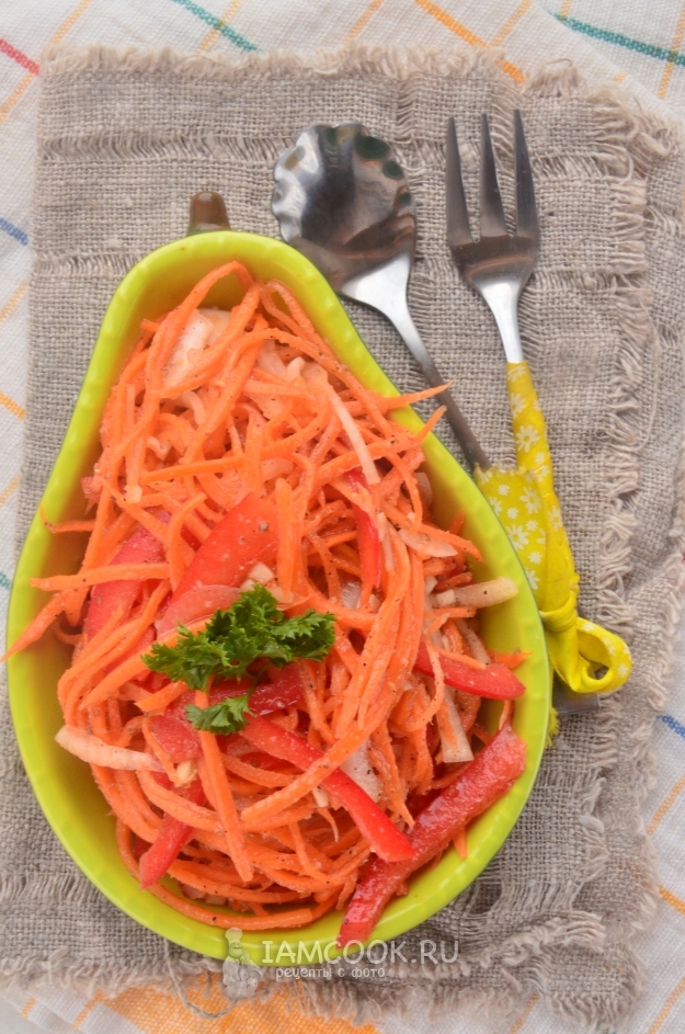 Перед самой подачей салат с морковью и болгарским перцем (по-корейски) можно украсить свежей зеленью.