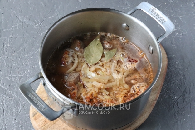 Выложить лавровые листы и отправить варочную ёмкость на огонь. Накрыть крышкой и довести до кипения.