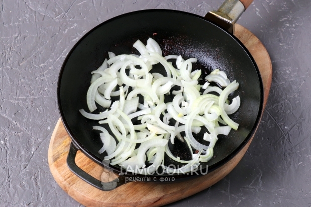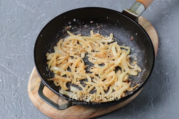 Затем на той же сковороде обжарить до мягкости нарезанный полукольцами репчатый лук.