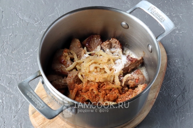 Содержимое сковороды переложить в кастрюлю к мясу. Добавить соль, чёрный молотый перец и приправу по вкусу.