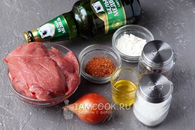 Подготовить продукты по списку к рецепту. Пиво можно использовать разных сортов (в моём случае - светлое). При выборе тёмных - в блюде будет более отчётливо ощущаться горький привкус хмеля.