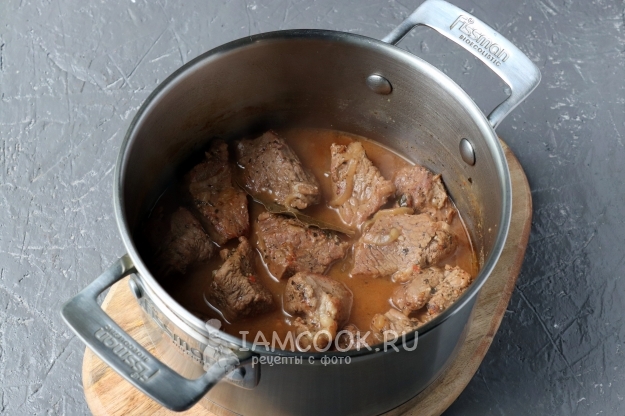 Томить на минимальном нагреве около 40-50 минут, в зависимости от жёсткости мяса.