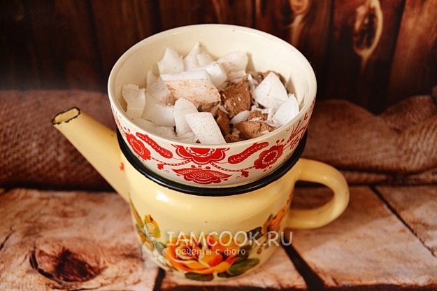 Какао масло и какао тертое немного измельчим, чтобы лучше топилось, и сложим в миску, которую установим над чайничком или кастрюлей с кипящей водой.