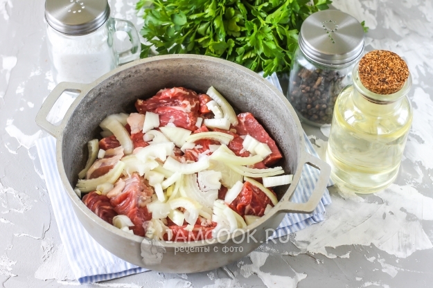 Очистите репчатый лук и промойте, нарежьте полукольцами. Влейте в казан растительное масло, прогрейте его на плите, и выложите внутрь емкости нарезанные мясо и лук. Аккуратно перемешайте.