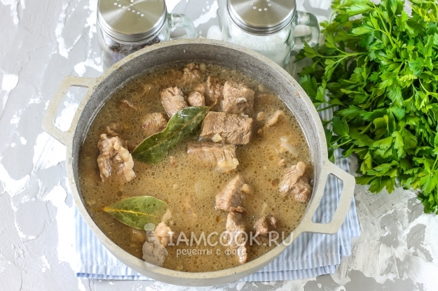 После этого влейте теплую воду, добавьте лавровые листья и убавьте нагрев до среднего. Доведите жидкость до кипения и удалите пену. Томите мясо около 30-35 минут, слегка прикрыв ёмкость крышкой, но не полностью, иначе будет образовываться пена. Время от времени перемешивайте тушеную говядину в казане. Если вода выкипит, влейте еще, но только кипяток, чтобы процесс тушения не останавливался.