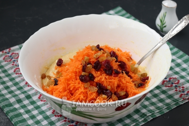 Морковь натереть на мелкой тёрке, промыть и обсушить сухофрукты (у меня - изюм и клюква). Ещё раз хорошо вымешать тесто.