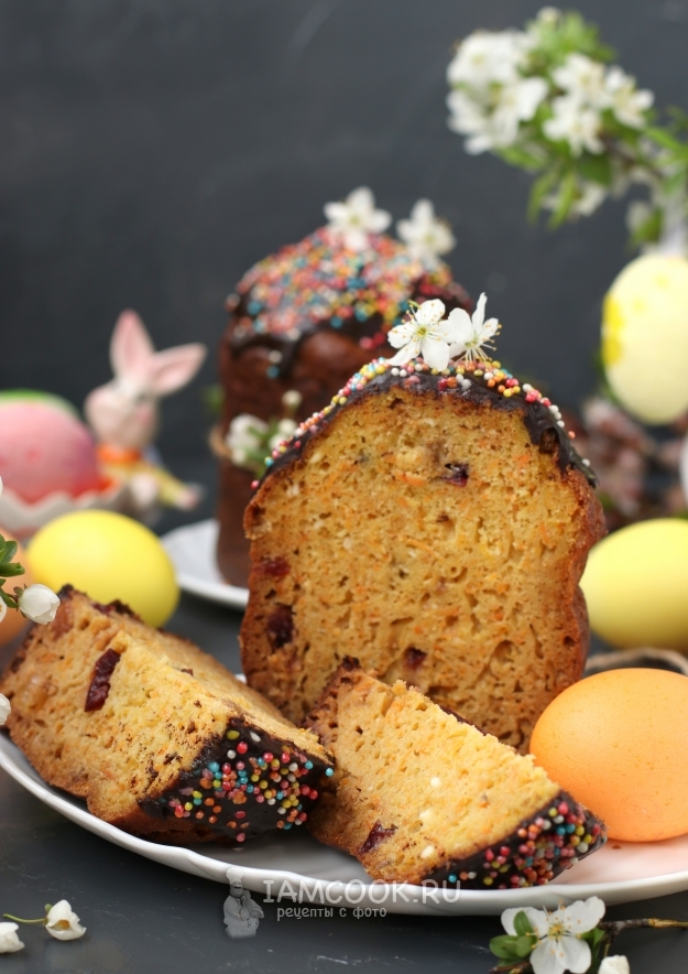 В этом сезоне я решила испечь творожно-морковный кулич. От оригинального рецепта отступила, сделала свои корректировки и заменила лимонный сок, апельсиновым, а также добавила в тесто цедру. Кулич получается в меру влажным, с приятным цитрусовым ароматом, сладким мякишем и ярким насыщенным цветом. Покрывала куличи шоколадной глазурью, которая отлично их дополнила.