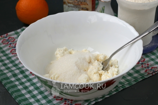Творог поместить в миску, добавить сахар и соль, растереть всё вместе вилкой.