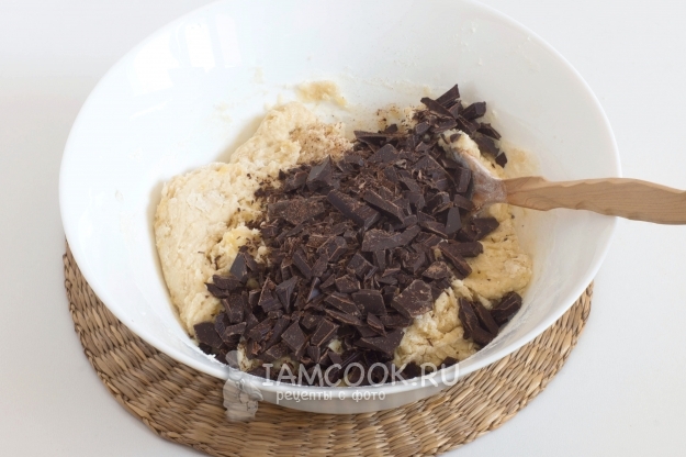 Добавьте мелкие кусочки рубленого шоколада. Еще раз недолго перемешайте тесто, чтобы шоколад максимально равномерно распределился по всему объему теста.