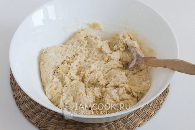 Муку соедините с разрыхлителем и постепенно добавляйте в банановую массу, замешивая тесто.