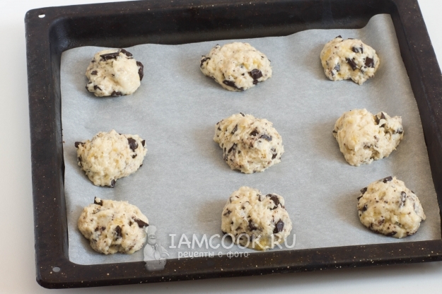 Далее я столовой ложкой брала тесто объемом с небольшое яйцо и выкладывала на противень, застеленный пергаментной бумагой. Расстояние между печеньями лучше оставлять побольше, они несколько увеличатся в объеме.