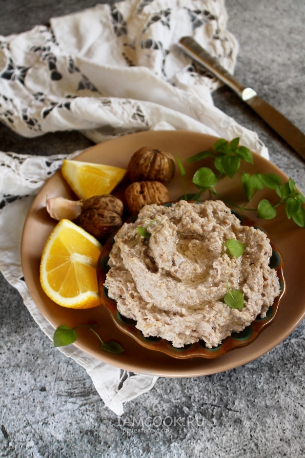 Скордалия с орехами готова, подавайте со свежими овощами и зеленью в качестве холодной закуски.