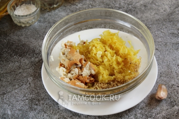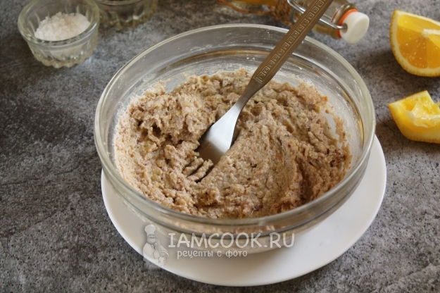 Соединяем ореховую крошку, очищенную и натертую картошку, размоченную и отжатую булку. Добавляем измельченный чеснок.