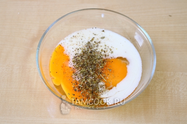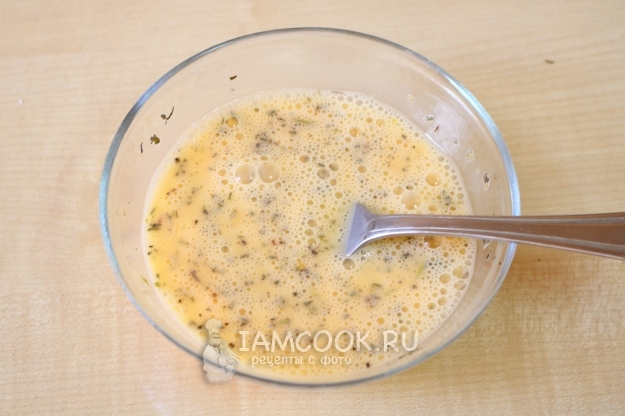 В миске соединяем ингредиенты для омлета: яйца, молоко, специи (соль, черный перец и прованские травы).