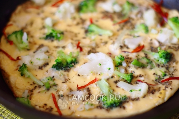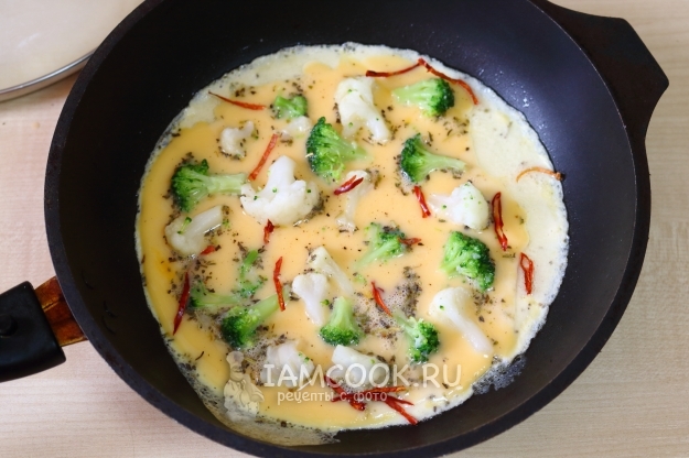 На сковороду, разогретую с растительным маслом, выливаем омлетную смесь и держим на огне 2 минутки, до схватывания яиц. Затем сверху выкладываем соцветия капусты и сушеные стручки красного перца и жарим под крышкой на небольшом огне до готовности яиц.