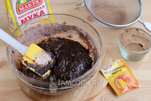 Просеиваем во взбитую массу муку, разрыхлитель и какао, перемешиваем лопаткой до объединения.