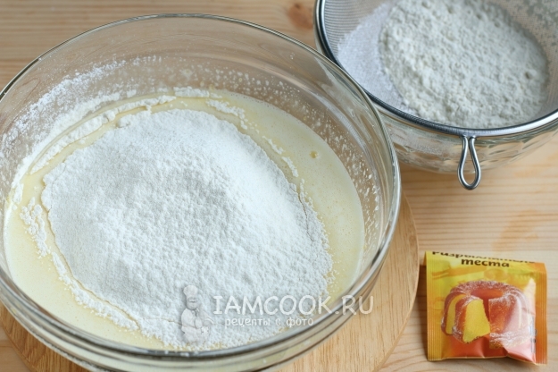 Просеиваем сюда же муку с разрыхлителем, смешиваем.