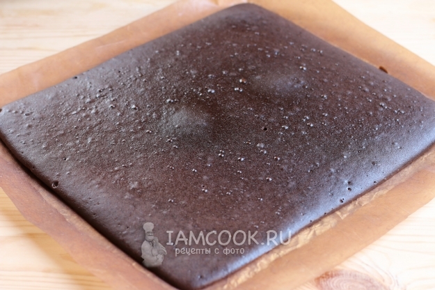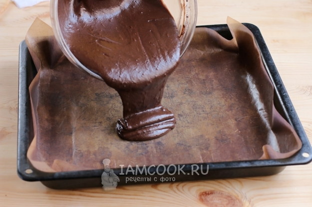 Выливаем тесто в противень, застеленный антипригарным ковриком, разравниваем поверхность и ставим противень в разогретую до 180 градусов духовку. Печем шоколадный корж 20-25 минут.