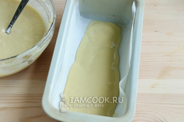 Форму для кекса проложим пергаментом, смажем его маслом и присыплем немного мукой. На дно формы выложим совсем немного светлого теста.