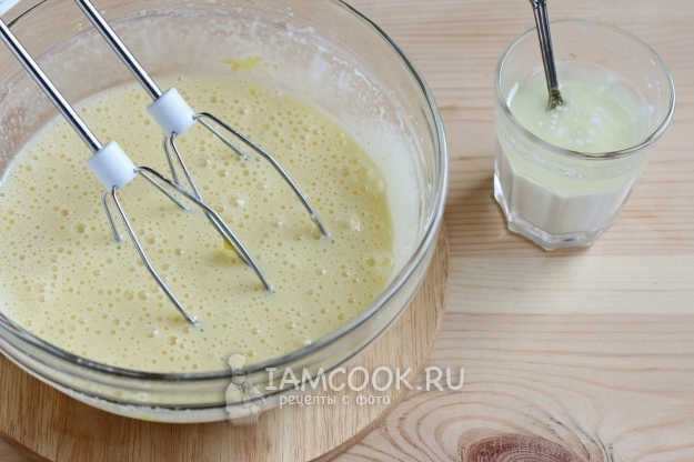 Вот теперь приступаем к приготовлению светлого теста для пасхального кекса. Также взбиваем яйца с белком и сахаром, добавляем ванилин, смешиваем молоко с растительным маслом. Выливаем молочно-масляную смесь во взбитую массу и снова взбиваем.