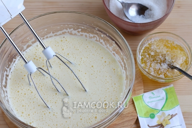 Вначале приготовим шоколадное. Для этого растопим сливочное масло и остудим, чтобы во время добавления в тесто оно не было горячим. Далее взбиваем яйца с необходимым количеством сахара при помощи миксера, добавим ванилин. После добавляем подготовленное масло, взбиваем еще раз.